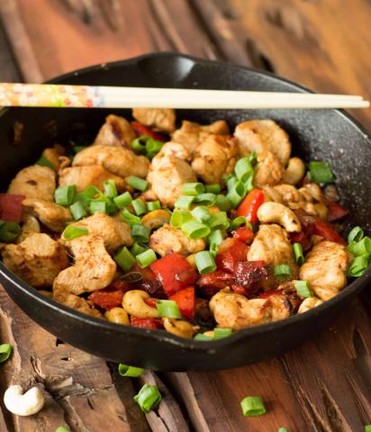 Verhit de olie in een wok op matig vuur en roerbak de cashewnoten in 2 tot 3 minuten lichtbruin. Haal ze met een schuimspaan uit de olie en laat ze uitlekken op keukenpapier.